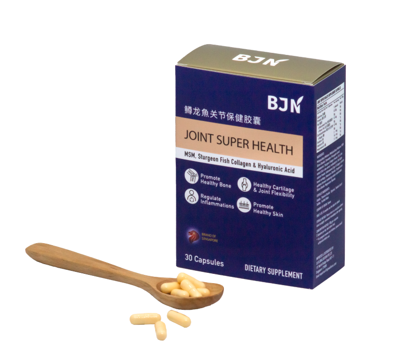 BJN’s Joint Super Health supplement from Taiwan has been specially formulated to support your bones. Arguably the best joint supplement in Singapore, it boasts Undenatured Type II Collagen, MSM, Sturgeon Fish Collagen, Hyaluronic Acid and other ingredients that can help with arthritis pain relief and skeletal health.